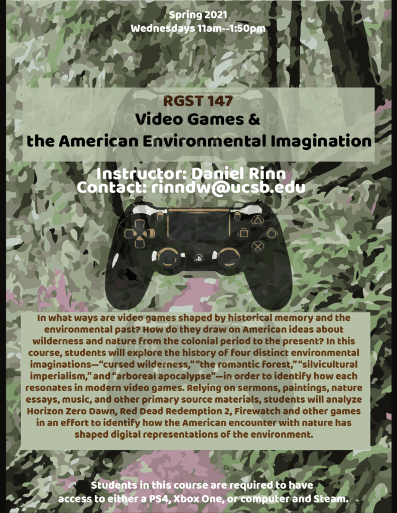 - In what ways are video games shaped by historical memory and the environmental past? How do they draw on American ideas about wilderness and nature from the colonial period to the present? In this course, students will explore the history of four distinct environmental imaginations—“cursed wilderness,” “the romantic forest,” “silvicultural imperialism,” and “arboreal apocalypse”—in order to identify how each resonates in modern video games. Relying on sermons, paintings, nature essays, music, and other primary source materials, students will analyze Horizon Zero Dawn, Red Dead Redemption 2, Firewatch and other games in an effort to identify how the American encounter with nature has shaped digital representations of the environment.