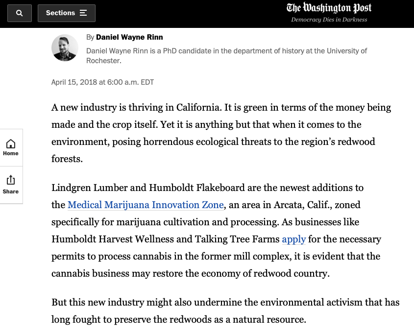 Interested in making my research accessible and relevant to our contemporary moment, I have also pursued public scholarship and teaching in other capacitates. I wrote an article for The Washington Post that draws attention to the environmental costs of legalized marijuana production in Humboldt County, CA.